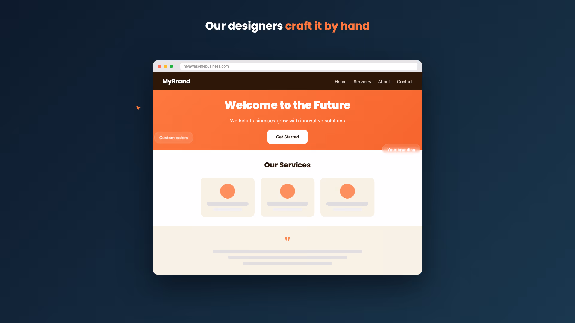 Tell us what you do and our team designs a professional website around it. Real people, real design work - not a drag-and-drop template with your logo on it.